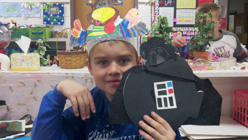 This week, Nov 15th 2010, was parent visitation for American education week at school. Today I went to visit my older boy, Derrick Lee Bradshaw, Jr, at his school. We started off by going outside and playing Frisbee. I think the kids wanted to show off the insane skills they had learned in PE class. After PE we went back inside and were given an assignment. Derrick and I were eager to tackle this mission! Given the Holiday season, our job was to take a turkey and disguise him so that he might not get eaten. Our turkey, named Gobbles, was in need of some serious help. If we did not step in he would surely be eaten by the end of next week! After Derrick and I talked it over we realized their was only one answer….. He needed a disguise. This “disguise” needed to hide him well but also put him in a position that nobody would even dare ask if he was a turkey! This calls for someone so scary, dangerous, and calculating that just the site of him would cause the prospective Turkey eater to shiver in his/her boots and not want to even make eye contact. Darth Vader! Remember this is the guy that was told his “force power” was merely a myth and from across the room, without a blink or a moment of hesitation, he almost chocked the poor commanding officer to death. However, because of his awesome helmet, that actually only adds to his spo0kiness, we will never know if he does blink. So we decided to disguise our turkey as this legend from Star Wars. As you can image Mr. Gobbles was very excited and eager to try on his new costume. I kept picturing Toy story where the green alien guys were saved and they kept saying “we are eternally grateful”. I handled the cape while Derrick Jr prepared his helmet and suit. After putting on his disguise, there was final touch needed to insure Mr. Gobbles would make it until Christmas and that was a quote that he could recite in the event someone was daring enough to actually speak to him. We decided to play on Darth Vader’s good qualities to draw sympathy from the would be accuser in this quote. What better way to do that then to express his regret toward the dark side and the event that led him back to the good side of the force. So we instructed Mr. Gobbles that if his facade were foiled, then the plan is to repeat the lines we gave him. If that does not work, well he is a turkey and has the ability to run. Maybe, while the distracted but hungry holiday eater is thinking about the sad sob story of Luke and his father, Mr. Gobbles can run away. Mission Accomplished!