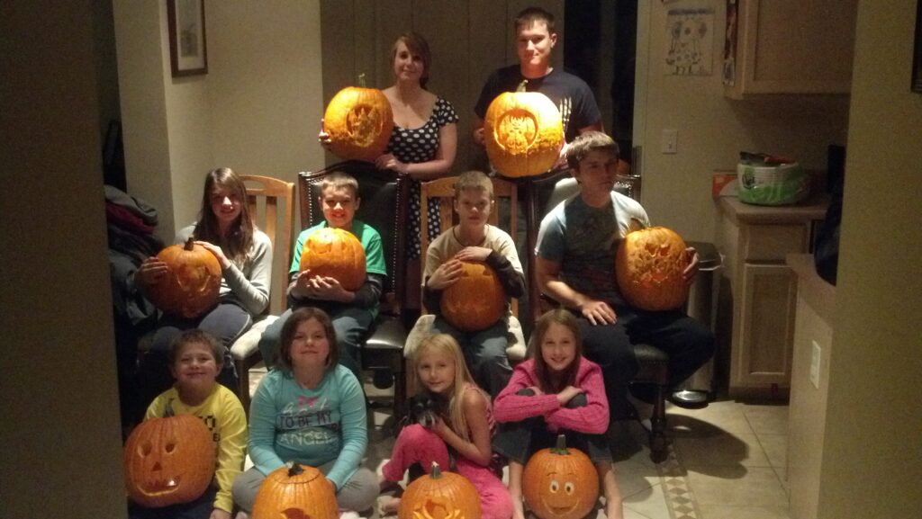 I just now realized I never published this blog and it has been sitting in my draft section since October. Every year Carmen’s family does a Pumpkin carving and last year we did the 2011 pumpkin carving at our house. However, his year it was done at Eric’s house. I look forward to doing this every year. It is nice to be part of a family tradition. It ended up being dark once all the pumpkins were carved so we took the picture inside.